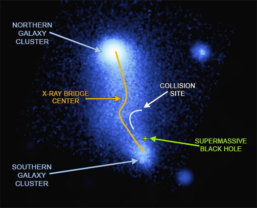 This superheated bridge of gas glows brightly in X-rays, which Chandra and XMM-Newton have detected.