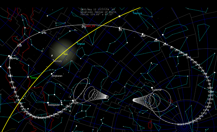 It is now expected to hover closer to magnitude 5. Either way it will be near the glare of twilight. It passed through the celestial equator on 7 May headed northward and will be near the 2nd magnitude star Algol on 20 May. In the Northern Hemisphere it might be best seen at the end of May when it is near the star Capella.