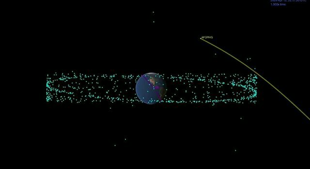 ✔Apophis2029/2036/2068 approaches. On April 13, 2029, Apophis will pass Earth closer than geosynchronous communication satellites, but will come no closer than 31,200 kilometres (19,400 mi) above Earth’s surface.