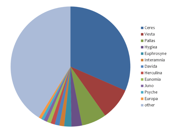 The first asteroids were named after mythical heroes and gods much like the major planets. The first to be discovered was named Ceres after the Roman goddess of growing plants (particularly grain) and of motherly love. The second asteroid discovered was called Pallas named after one of the Greek gods of wisdom. Asteroids are also given a number in the order of their discovery, so Ceres is 1, Pallas is 2, and so forth. As the number of know asteroids increased