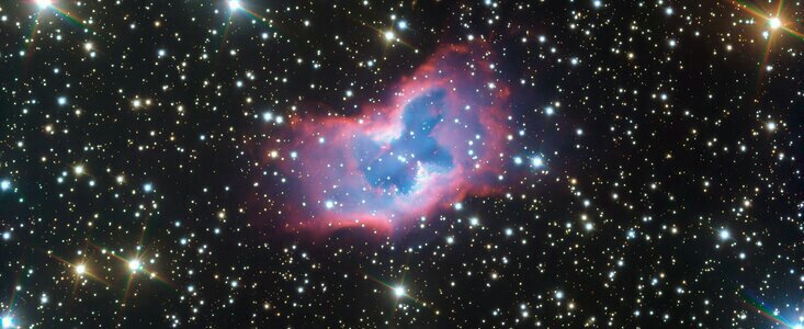 Resembling a butterfly with its symmetrical structure, beautiful colours, and intricate patterns, this striking bubble of gas — known as NGC 2899 — appears to float and flutter across the sky in this new picture from ESO’s Very Large Telescope (VLT). This object has never before been imaged in such striking detail, with even the faint outer edges of the planetary nebula glowing over the background stars.